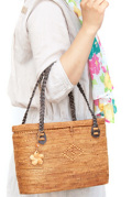 アタバッグ製品にはすべて当店オリジナル、プルメリアモチーフの木製チャームをおつけしています。店名の由来ともなっているプルメリア(インドネシア語で「Jepun」)の花をモチーフにしたチャームは、温かみのある木製と革紐でお作りしていますので、アタバッグによく似合います。
