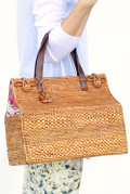 ▲アタで編まれたリボン飾りで可愛さアップ。革製の持ち手は幅広タイプでしっかり取り付けられているから、とっても持ちやすいです。