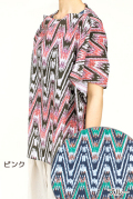 存在感バツグンのエスニック柄ポンチョです。 黒を効かせて大人っぽくまとめたブルーとピンクのエスニック柄。