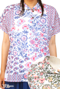 キレイ色の花がらがプリントされた、大人のエスニックファッションにピッタリの丸襟半袖ブラウスです。