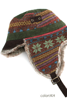 落ち着いた秋冬カラーでファー付き耳あてが付いたノルディック柄の帽子。