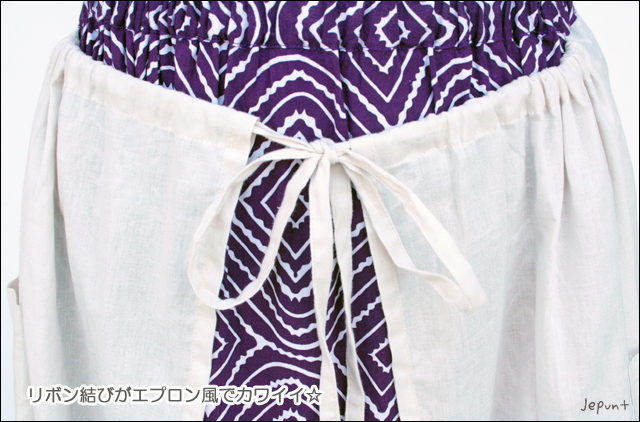 コットン100%の白いエプロン風スカートが柄を落ち着かせて