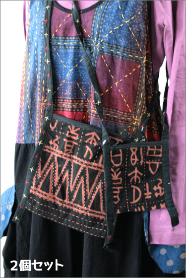 刺し子がポイントの、エスニックな布製ポシェットが2個セットで登場です。