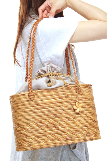 ▲優しいナチュラルカラーで、肩掛けでも手提げでも使える巾着フタ付きのアタバッグ。