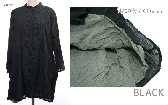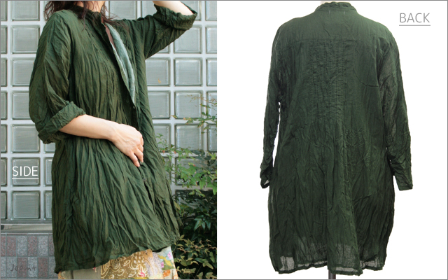 シックな色をそろえて色違いの裏地が入った、クリンクル(しわ)加工のピンタックロングシャツです。