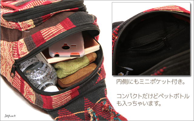 ▲大人気のモン族刺繍布をたっぷり使ったワンショルダータイプのボディバッグ。携帯やパスケースなど入れておけるチャック付きポケットなどがついています。