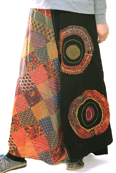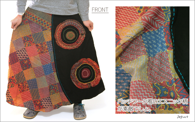 パッチワーク風のエスニックな生地に刺し子を入れた、エスニックファッションにぴったりのロングスカートです。