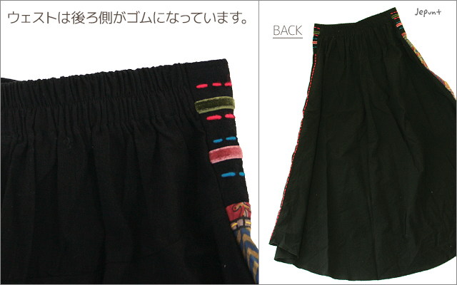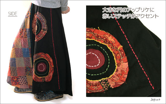 パッチワーク風のエスニックな生地に刺し子を入れたロングスカートです。ブラックカラーにエスニック柄でマキシ丈のエレガントなスカートは、エスニックファッションコーディネートをグッと大人っぽく見せてくれます。
