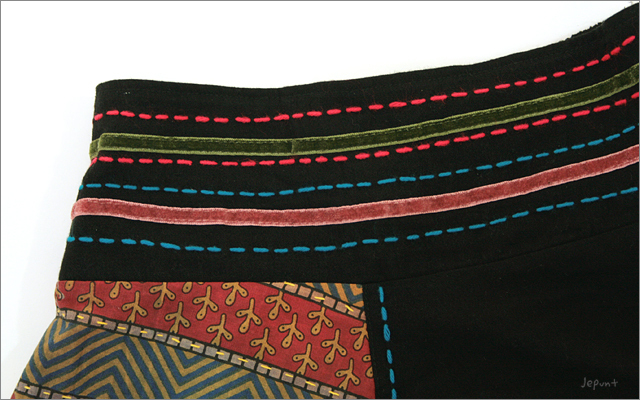 ▲パッチワーク風のエスニック柄に刺し子を効かせたマキシ丈スカート。