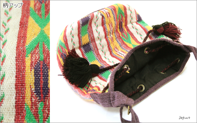 ▲赤や黄色に緑などカラフルなエスニック柄。フサ付きの紐でバッグの口を閉じます。しっかりした厚手の生地で手触りも良し。