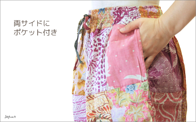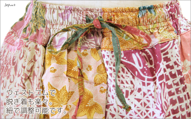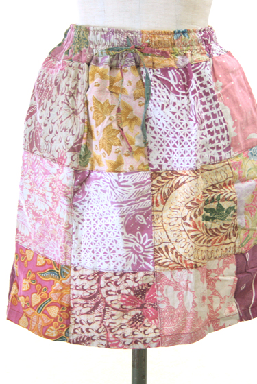 バリ島のピンク系のバティック古布をパッチワークしたショート丈のスカートです。