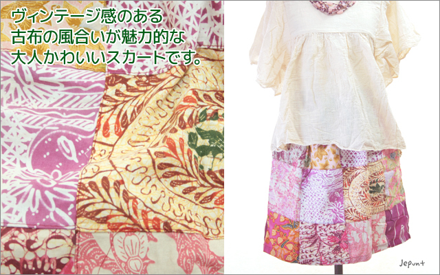 バリ島のバティック古布をパッチワークしたショート丈のスカートです。ヴィンテージ感のある古布の風合いが魅力的で、大人かわいいコーディネートにもぴったり。
