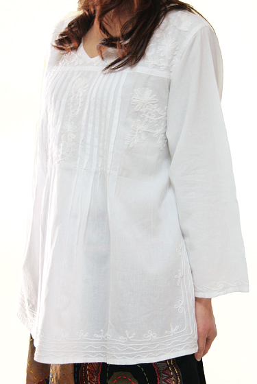 ▲袖にも刺しゅうがほどこされたエキゾチックなホワイトカットソーは、ナチュラルコーディネートや大人かわいいエスニックファッションコーディネートにもぴったりです。