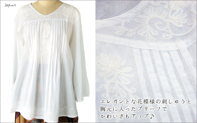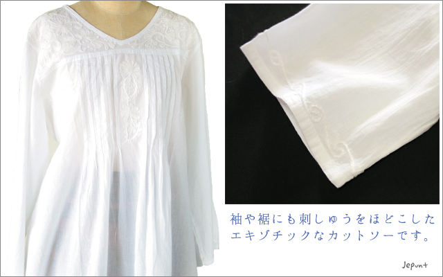 袖にも刺しゅうがほどこされたエキゾチックなホワイトカットソーは、ナチュラルコーディネートや大人かわいいエスニックファッションコーディネートにもぴったりです♪