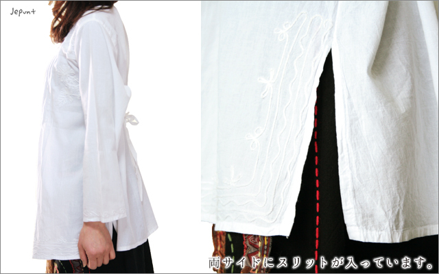 裾にも刺しゅうが入ったこだわりのデザイン。両サイドにスリットが入っています。