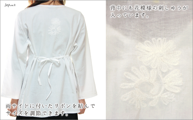 ▲リボン紐を結んでサイズを調節できるので、タイトにもゆったり目にも着こなせます。背中にもワンポイント刺繍が入っていて、後ろ姿も抜かりなし。
