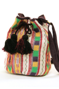 ▲赤や黄色に緑などカラフルなエスニック柄。フサ付きの紐でバッグの口を閉じます。しっかりした厚手の生地で手触りも良し。